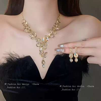 高级感闪钻耳环项链套装!轻奢小众礼服晚宴锁骨链新娘婚纱配饰女