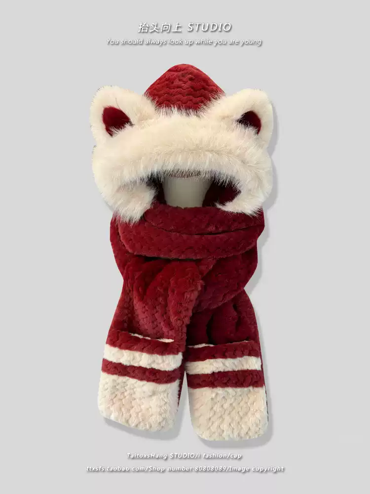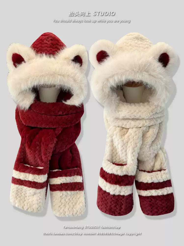 小熊拼色毛绒帽子围巾手套一体女加绒加厚骑车护耳保暖雷锋帽