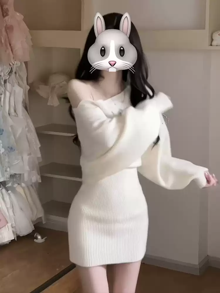 白色一字肩长袖连衣裙女秋冬装法式高级感烫钻针织包臀显瘦短裙子
