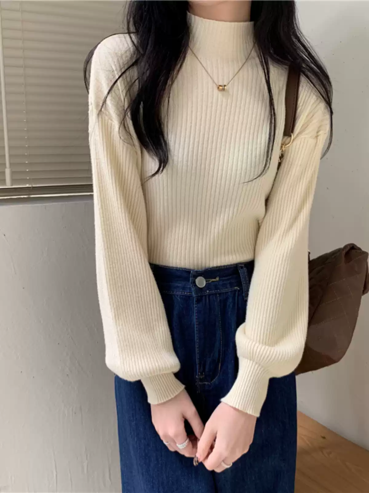 黑色毛衣女秋冬新款打底灯笼袖半高领针织衫修身内搭长袖上衣