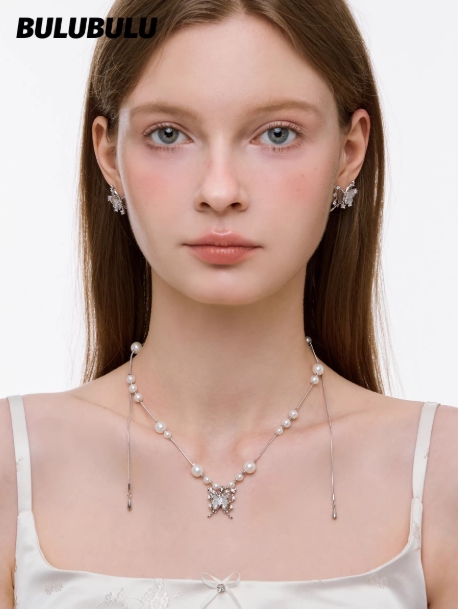 BULUBULU 蜕变之语系列镂空蝴蝶伸缩锁骨链原创耳夹珍珠叠戴项链
