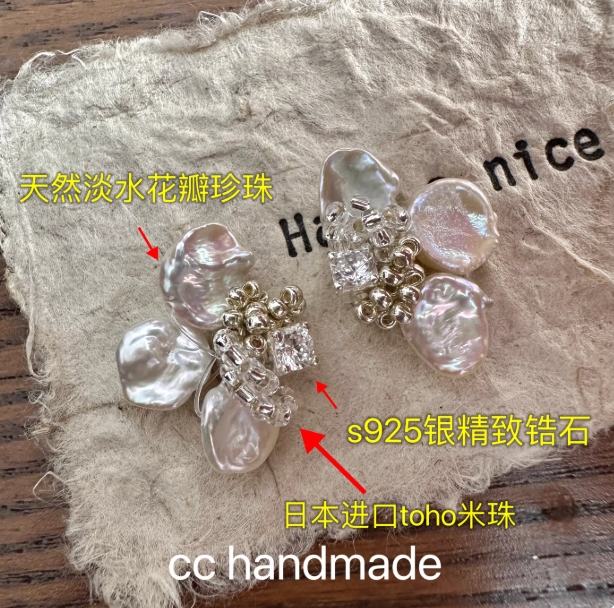cc手作 原创设计 天然珍珠花瓣s925银锆石鸢尾耳钉耳夹耳环 自留