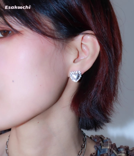 Esakoochi甜蜜回忆~原创银色抱枕爱心耳钉粉钻甜美小巧高级耳饰