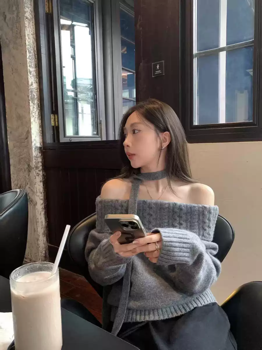 韩系灰色一字肩毛衣女秋冬高级感宽松外穿慵懒风独特漂亮针织上衣
