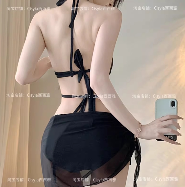 爆款黑色性感小胸聚拢加厚带钢托钻链比基尼度假温泉三件套泳衣女