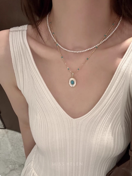 MISS HELEN茶白仿绿松石水晶仿珍珠项链女精致气质优雅通勤
