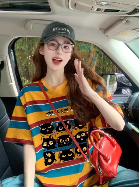 法国Rouje Rosella⭐复古条纹短袖t恤女撞色设计小众卡通印花上衣