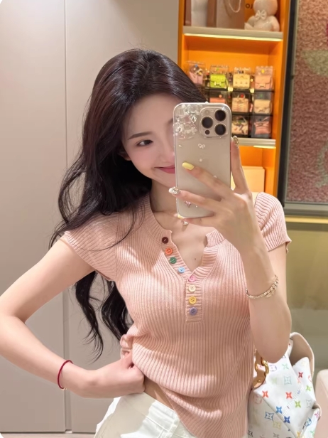 韩版多巴胺纽扣v领针织短袖T恤女夏小香风设计感气质显瘦别致上衣