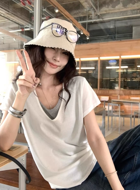 叠穿假两件白色短袖女v领正肩t恤2026夏宽松慵懒半袖体恤通勤上衣