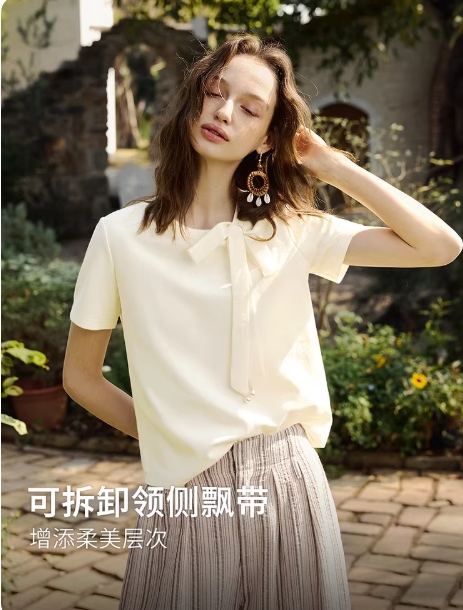 欧芮儿可拆卸飘带法式设计感短袖T恤女夏季2026新款正肩圆领上衣