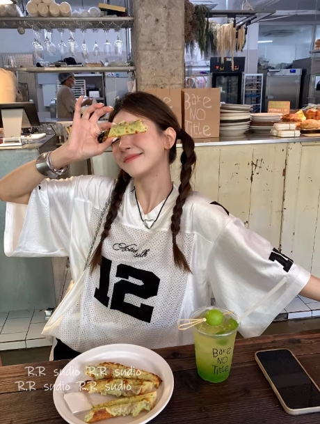 韩国现货!2000arcves数字球衣短袖女美式复古拼色V领网面运动T恤