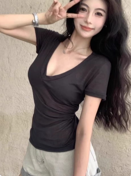 2026春秋新款V领短袖上衣女性感纯欲风微透锁骨小衫高级感t恤