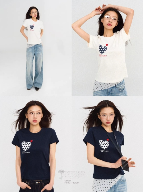 U6UU PinkTribe 韩系爱心波点短袖T恤女夏季修身显瘦百搭圆领上衣