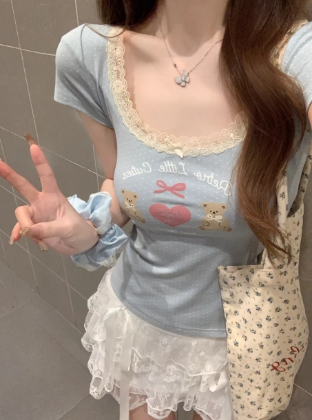 2026夏季韩系纯欲方领蕾丝波点卡通印花少女修身短袖T恤短款上衣