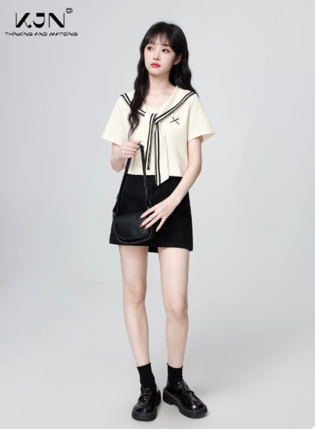 法式正肩短袖T恤女2026夏季新款海军领学院风披肩设计感体恤上衣
