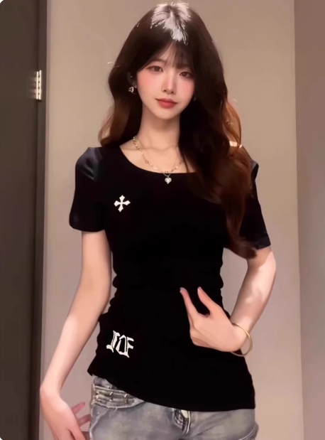 正肩短袖t恤女夏季美式复古辣妹风显瘦收腰设计感修身漂亮上衣潮