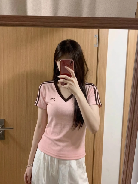 蝴蝶结绣花V领正肩短袖t恤女夏季撞色三条杠显瘦收腰上衣韩系穿搭