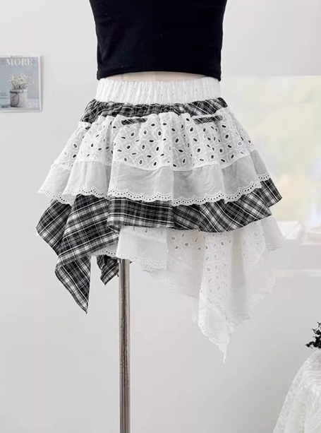 y2k辣妹蕾丝拼接格子半身裙女夏季不规则蛋糕短裙设计感a字蓬蓬裙