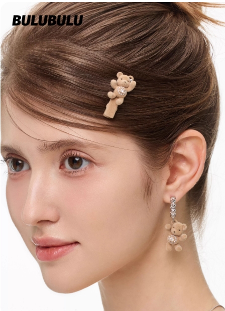 BULUBULU粉色植绒小熊发夹女甜酷少女珍珠小众设计粉熊边夹发饰品