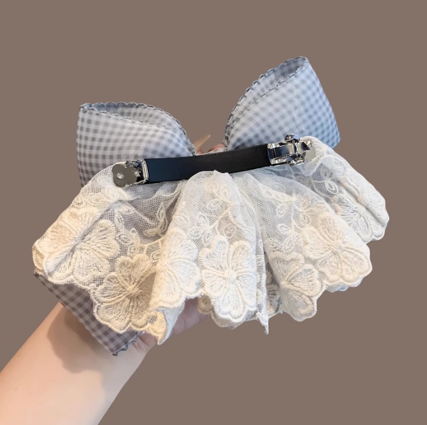 韩系格纹蓝色蝴蝶结发夹小清新超仙蕾丝小裙摆顶夹半扎发横夹发卡