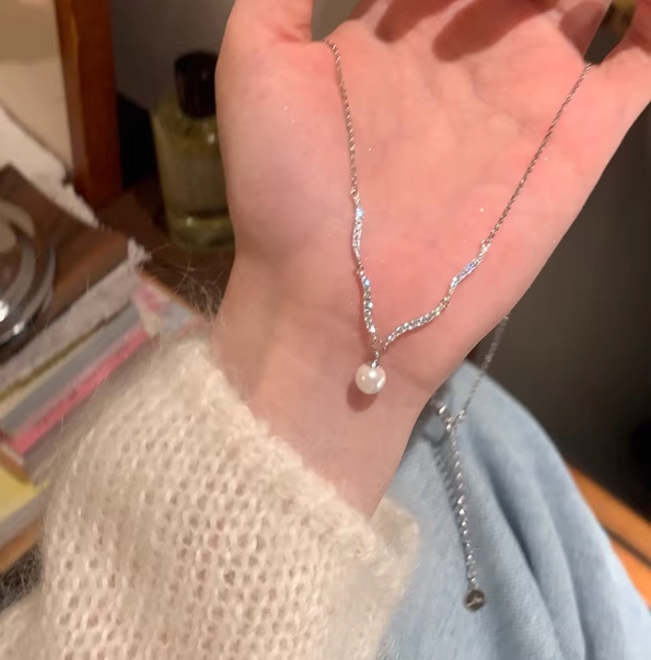 气质闪锆波浪珍珠吊坠锁骨链高级感轻奢小众项链女毛衣链颈链配饰