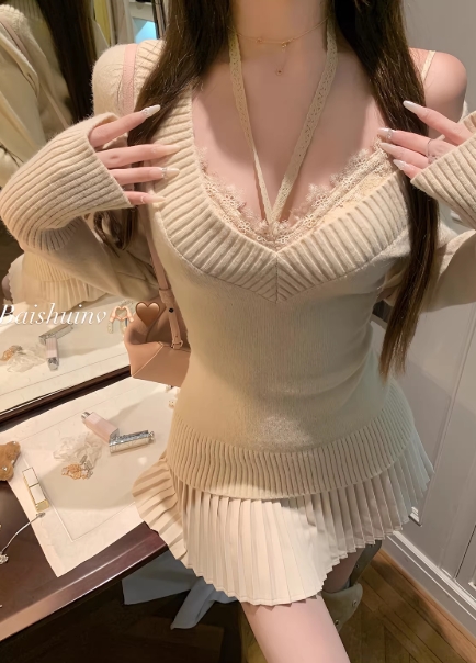 白水女 高智感姐姐 V领毛针织衫女毛衣百褶裙韩系秋冬新年套装