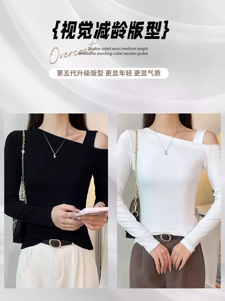 黑色斜肩吊带长袖t恤女2025春秋修身百搭露肩性感打底衫显瘦上衣