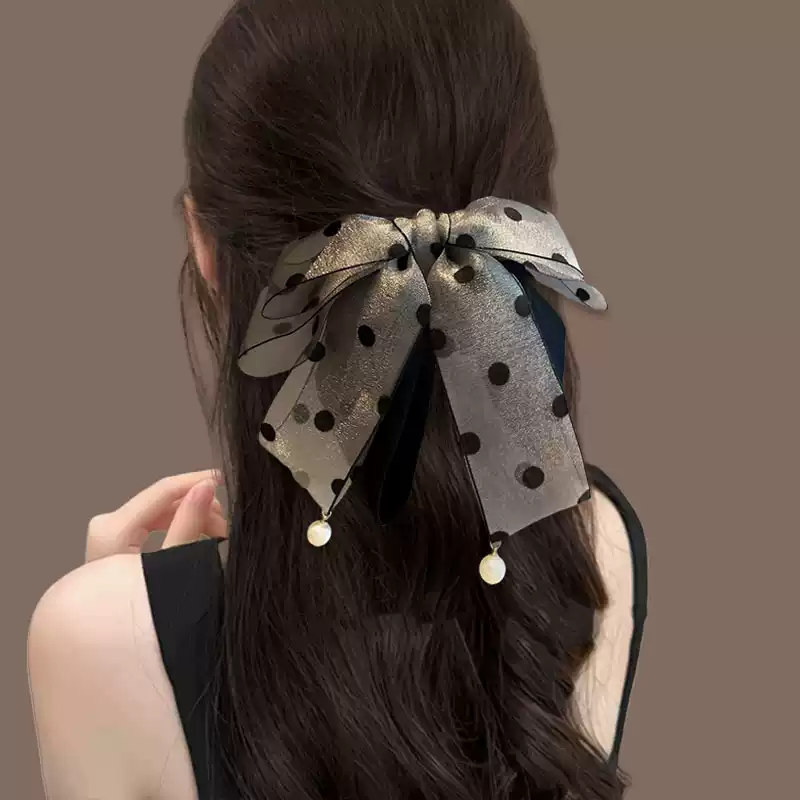 高级感网纱波点灰色蝴蝶结高马尾神器抓夹女后脑勺百搭发夹发夹子