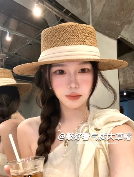法式平顶草帽女夏季老钱风编织礼帽海边度假沙滩大檐防晒太阳帽子