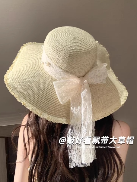 蕾丝蝴蝶结草帽女夏季海边沙滩度假遮阳防晒气质法式甜美太阳帽子