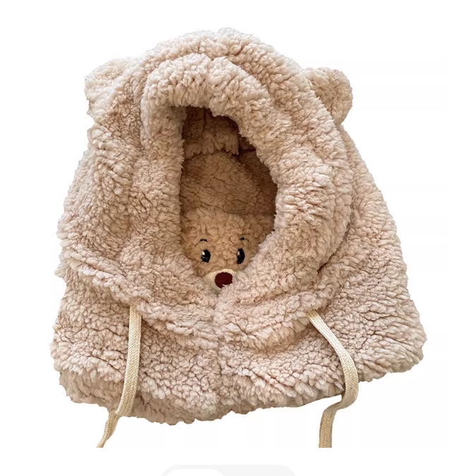 可爱小熊帽子围巾一体女冬季骑车保暖护耳毛绒加厚带口罩围脖连帽
