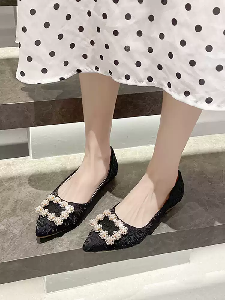 仙女风珍珠单鞋女百搭软底豆豆鞋2025春秋季新款尖头浅口平底瓢鞋
