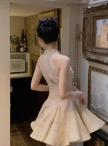 小个子新中式国风旗袍复古挂脖连衣裙女夏季高级感收腰a字短裙子