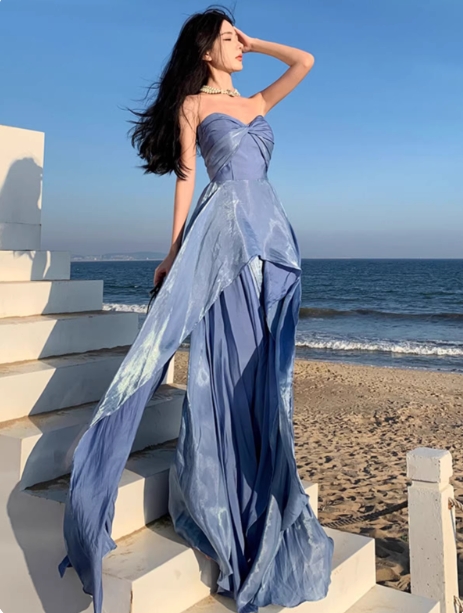高级感飘逸女神蓝色抹胸连衣裙法式气质轻奢拍照礼服度假拖尾长裙