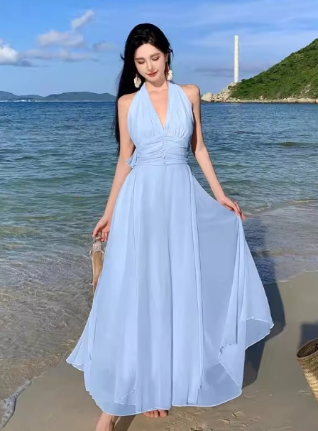 无袖V领挂脖连衣裙夏季新款温柔气质收腰显瘦连衣裙仙气超仙森系