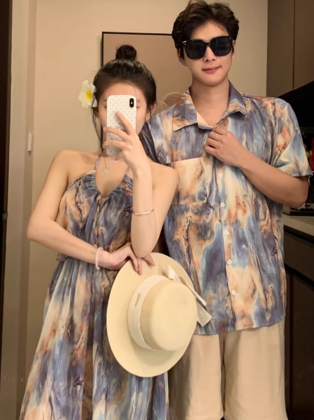 法式情侣装夏季新款度假风沙滩海边吊带女连衣裙旅游宽松一裙一衣