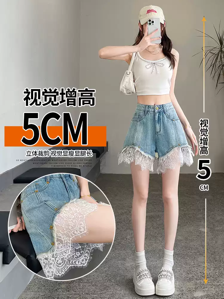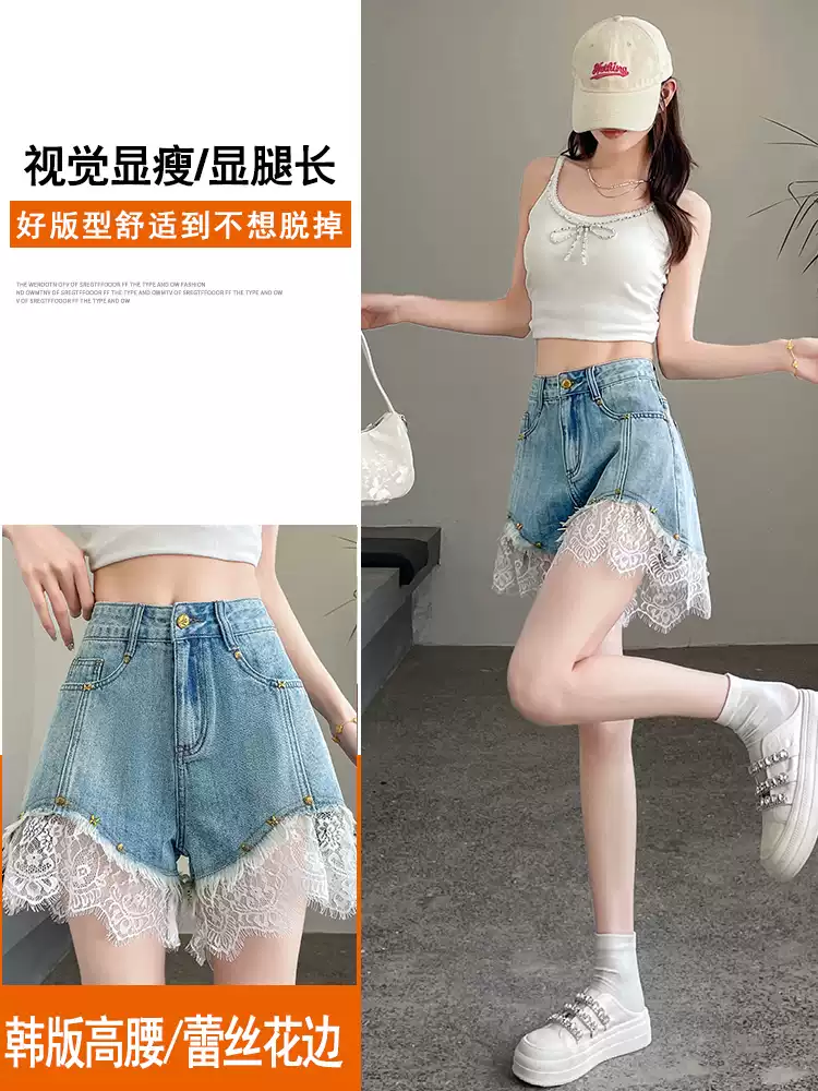 复古拼接蕾丝花边牛仔短裤女士2025夏季a字小个子宽松甜妹短裤子