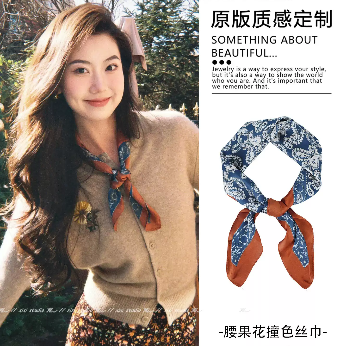 蓝色腰果花系脖丝巾冬季轻奢撞色领巾小方巾气质护颈配饰新品