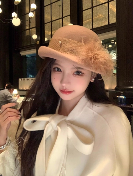 暖冬白月光~法式千金羽毛卷边礼帽女冬季优雅白色羊毛呢渔夫帽子