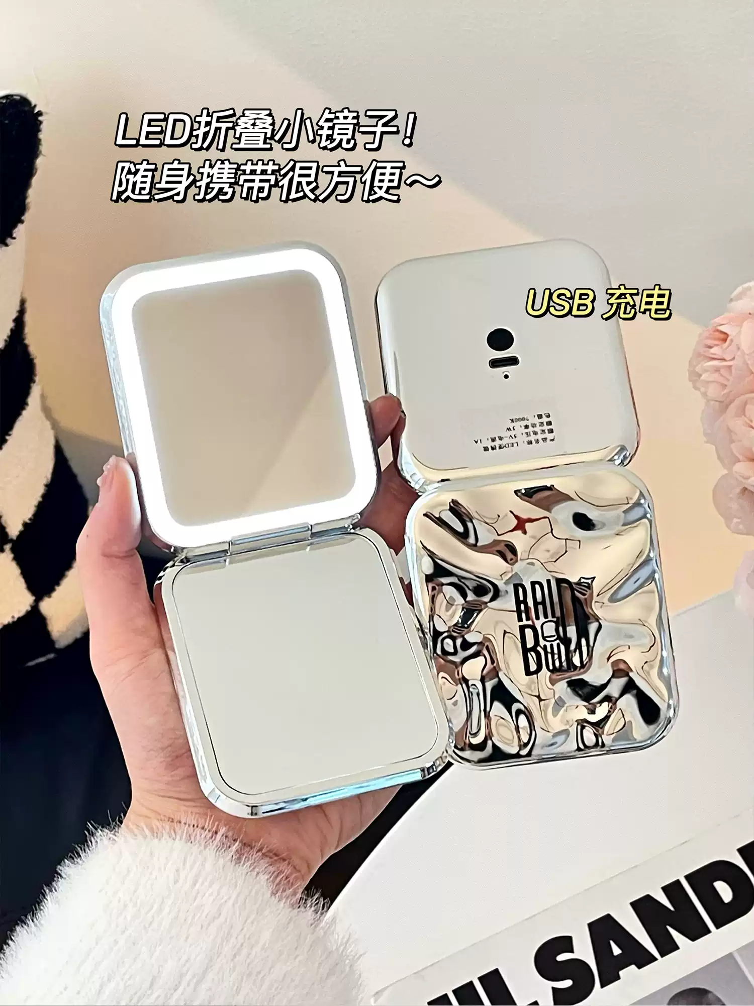 化妆镜带灯led随身镜外出便携式小镜子家用梳妆台桌面迷你折叠镜