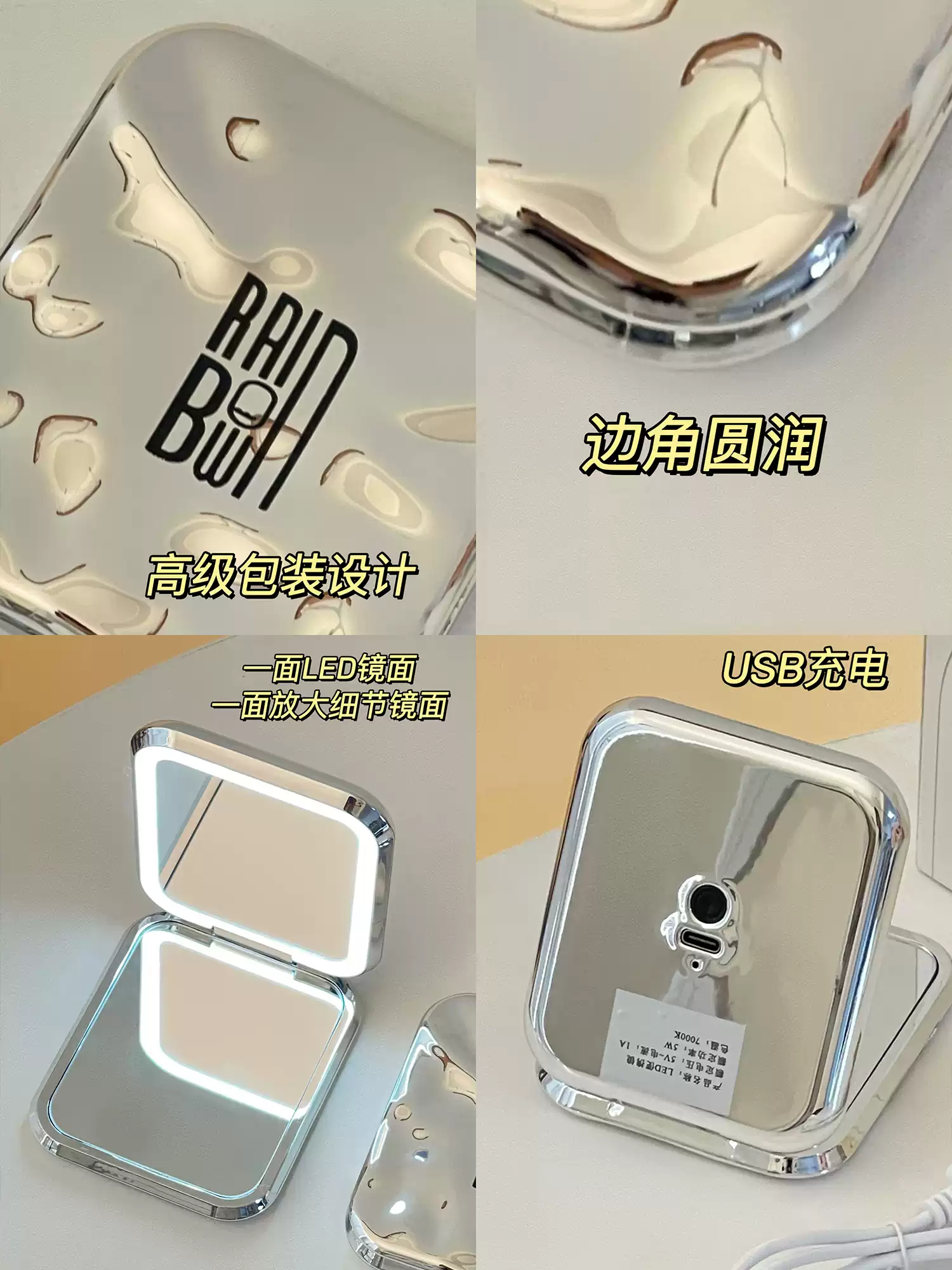 化妆镜便携随身小镜子带灯led补妆镜口袋迷你手持发光折叠圆镜子