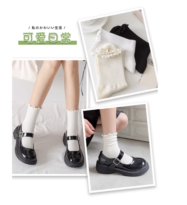 袜子女秋冬季木耳边堆堆袜黑白纯色中长筒地板运动袜日系网红款潮