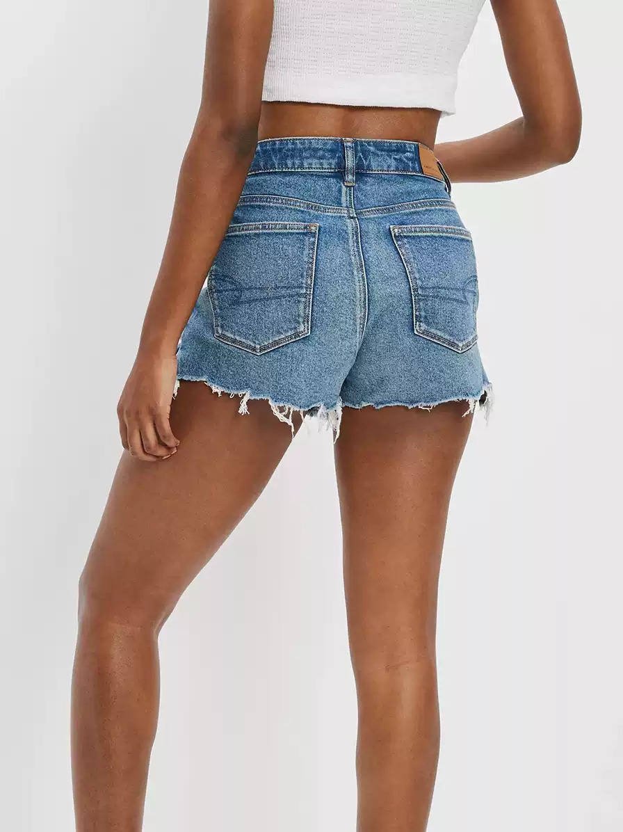 AEO 美国鹰夏季新款蓝色高腰无弹修身显瘦磨破洞毛边牛仔短裤女潮