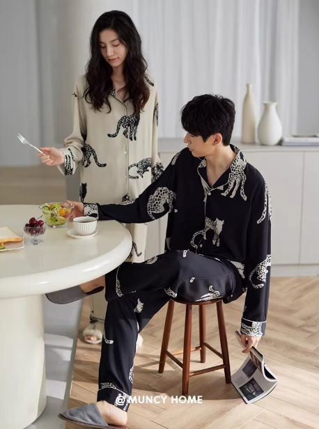 春秋睡衣情侣款简约家居服韩版豹子长袖男女套装