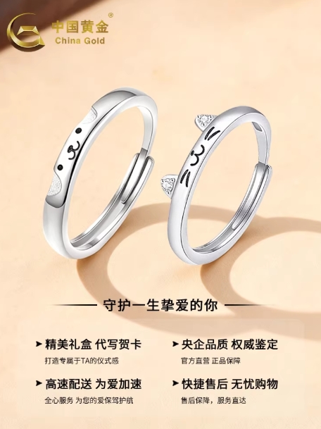中国黄金纯银小猫小狗情侣对戒足银戒指一对小众情人节礼物送女友