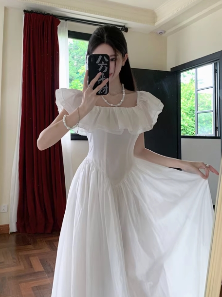 2025夏季白色气质荷叶边飞飞袖礼服长裙收腰显瘦a字漂亮连衣裙女