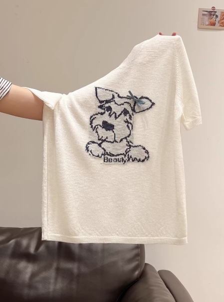 夏季新款白色卡通小狗绣花圆领毛针织衫女装2026韩系薄款短袖T恤