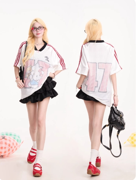 NERESUM美式运动风Kitty猫印花短袖T恤女复古透气网眼宽松上衣