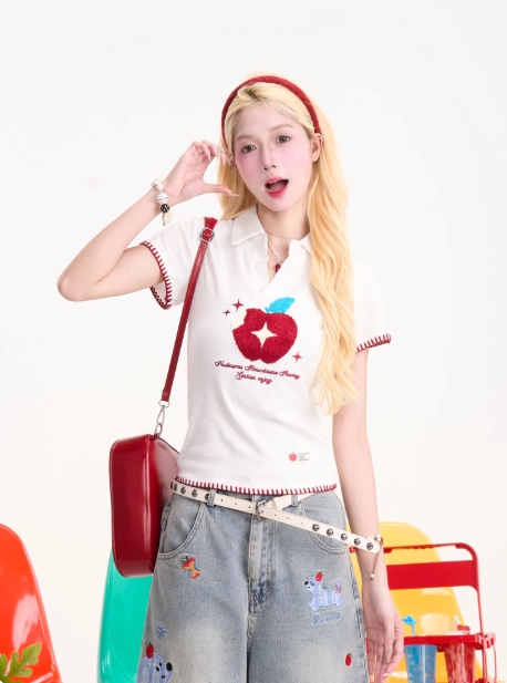 NERESUM苹果毛巾绣POLO领短袖女潮牌减龄正肩T恤新款修身短款上衣