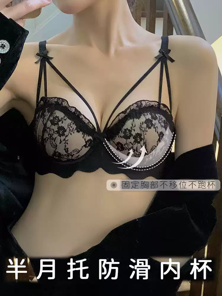 小胸聚拢显大内衣女性感胸罩无钢圈纯欲蕾丝上托文胸罩黑套装大胸